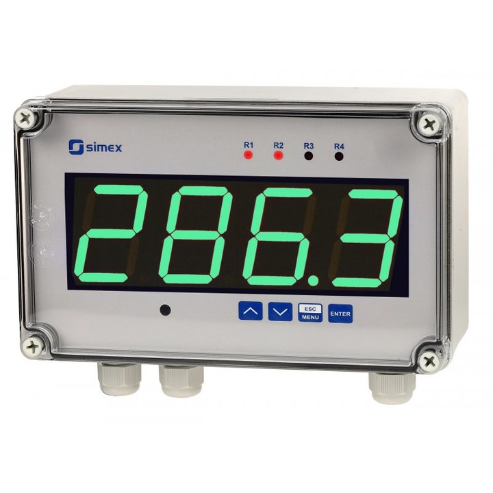 Miernik z wejściem uniwersalnym 0/4-20mA, 0/1-5V, 0/2-10V,0-60/75/10/150mV, Pt100/500/1000, termopara K, S, J, T, N, R, B, E, bardzo dużym, wyraźnym 57-mm wyświetlaczem LED (multikolor lub ultra bright: czerwony, zielony, niebieski) oraz szczelną obudową o stopniu ochrony IP 67; Wyposażony opcjonalnie w 2 lub 4 wyjścia przekaźnikowe/OC oraz wyjście analogowe (do wyboru: aktywne wyjście prądowe, pasywne izolowane wyjście prądowe lub aktywne wyjście napięciowe). Urządzenie automatycznie kompensuje temperaturę zimnych końców termopary. Wejścia RTD oraz TC posiadają pełną linearyzację charakterystyk. Nowa funkcja przekaźników naprzemiennych (alternating relays) umożliwia automatyczne przełączanie wyjść, co znajduje zastosowanie m.in. w sterowaniu pracą dwóch pomp na zmianę.